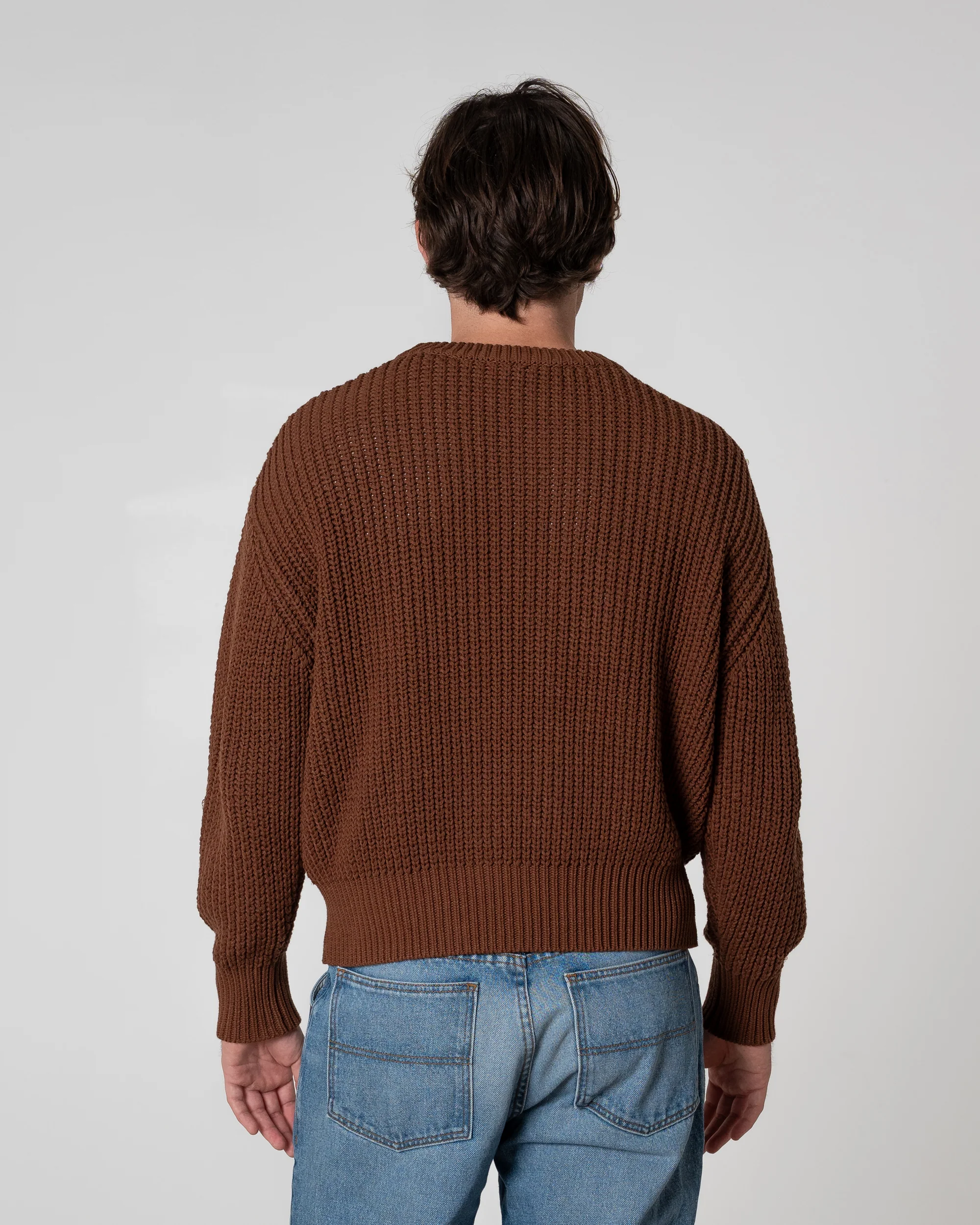 The Fisherman Knit Sweater is a nod to nautical knits of the past. With a high twist cotton yarn in a chunky knit pattern, this sweater is soft and comfortable on the skin. Finished with elongated cuffs and a thick ribbed neckline inspired by vintage fisherman knits. This sweater features a slightly cropped and boxy fit with exaggerated arms to give it a modern feel.